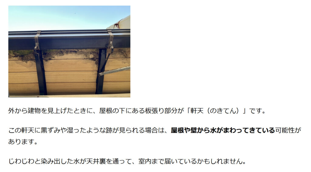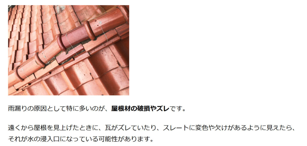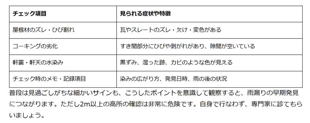 雨漏りの原因は、屋根材のズレやひび割れ、コーキングの劣化、軒裏の染みといった、見た目に分かりやすいサインが出ている場合があります。