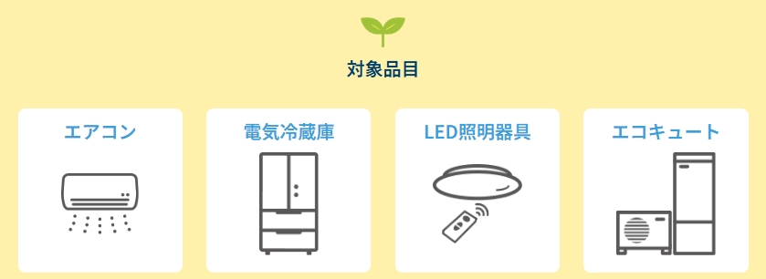 福島県が実施するこのキャンペーンは、県内にお住まいの方が対象の省エネ家電を購入した場合に、ポイント等の付与を受けられる制度です。公式サイトでは、対象品目としてエアコン・電気冷蔵庫・LED照明器具・エコキュートが案内されています。