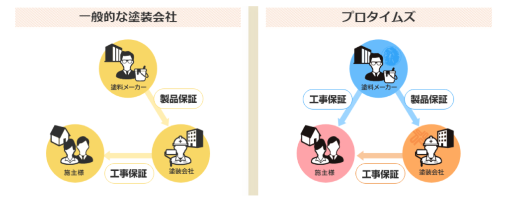 つまり、プロタイムズの塗装会社が手掛けた屋根・外壁塗装には、「プロタイムズ塗装会社」+「プロタイムズ運営本部」(株式会社アステックペイント)のダブル保証が付くというわけです。